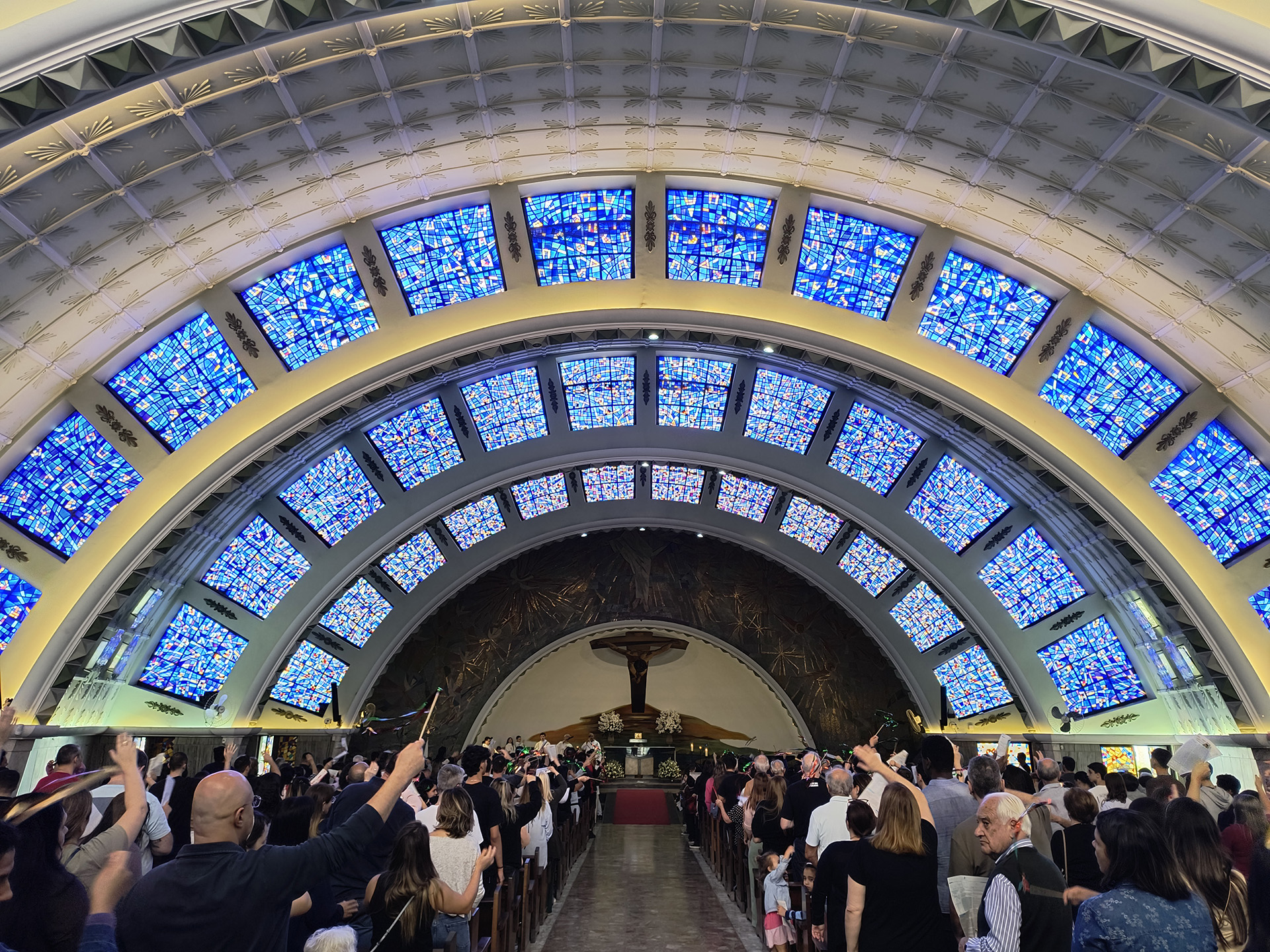 A Igreja possui cinco arcos de cúpulas seguidos, em forma de túnel, que permitem através dos vitrais, colocados entre os arcos (superior e inferior), a iluminação indireta do templo.