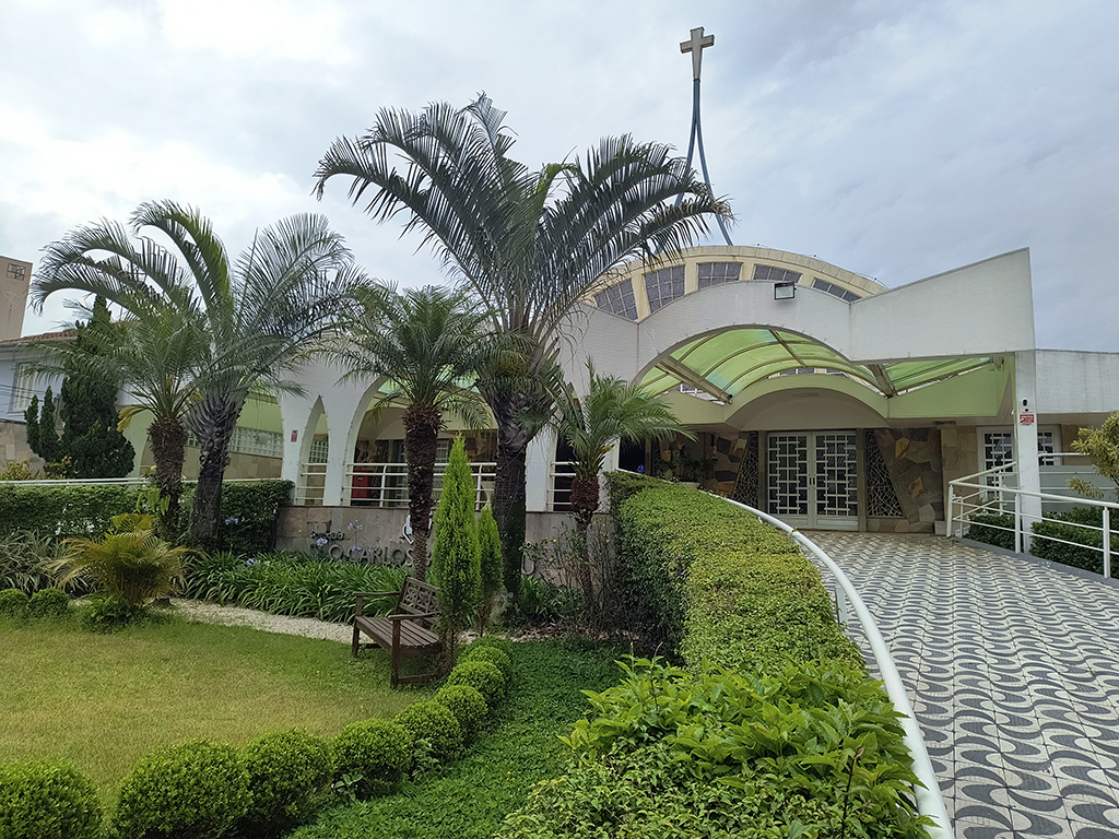 O mosaico, que antecede o altar, é centralizado com a imagem do Cristo Ressuscitado. Os tons claros e leves reflexos dourados, proporcionam um clima de paz e tranquilidade, tão propício para o recolhimento e a oração.